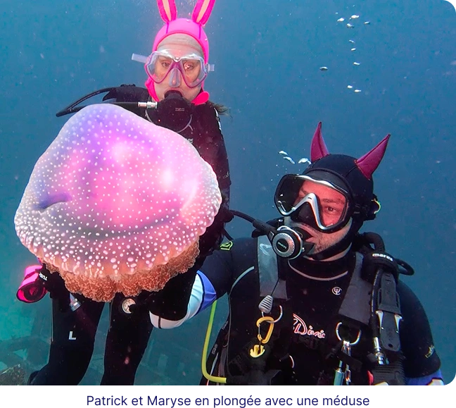 Sa partenaire de plongée privilégiée : Maryse. Il était présent lors de ses toutes premières plongées et l’a accompagnée tout au long de sa progression jusqu’à ce qu’elle atteigne le niveau de Dive Master. Ensemble, ils ont partagé des aventures aquatiques marquantes qui ont renforcé leur complicité bien au-delà de la surface. Ce lien commun avec la mer symbolise aussi leur manière de vivre : en profondeur, en confiance et toujours en quête d’harmonie sincère.